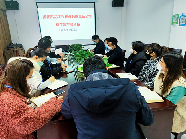 2020年3月2日,贵州黔龙工程建设有限责任公司在防疫物资准备充足、符合国家相关规范的情况下正式复工,公司全体员工于当日下午13:30在公司四楼会议室召开了复工启动大会,同时开展了新型冠状病毒防疫知识培训。