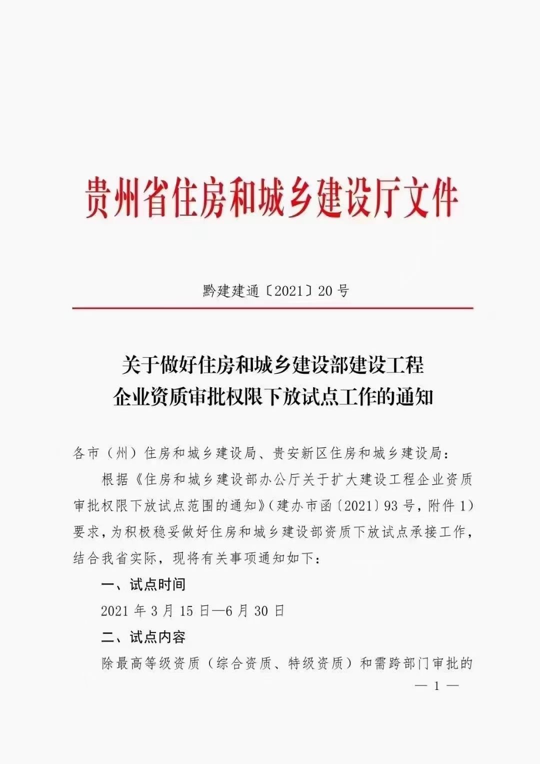 关于做好住房和城乡建设部建设工程企业资质审批权限下放试点工作的通知(黔建建通〔2021〕20 号)