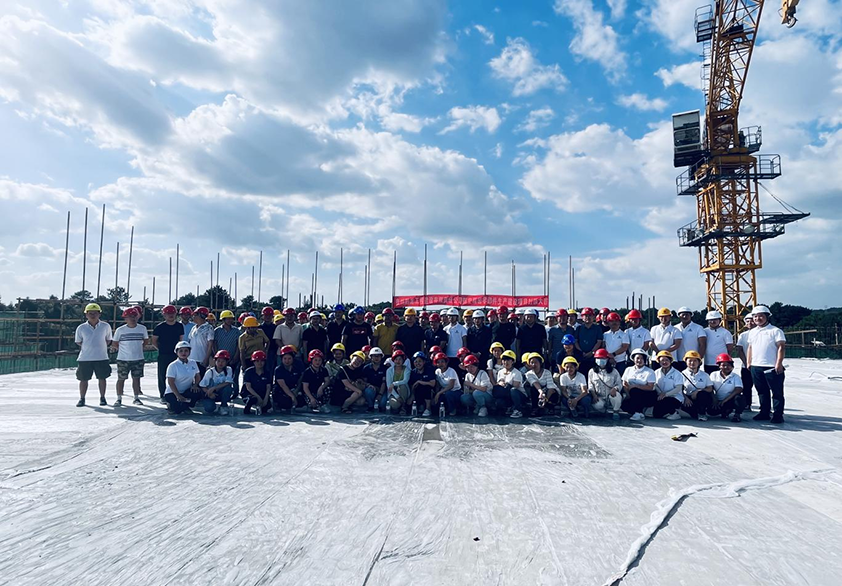 为庆祝本次封顶,我公司特于2023年7月15日下午16:58在103号厂房楼顶举办了隆重的封顶仪式。参加本次封顶仪式的有贵阳市经开区工信局孙局长、贵阳市经开区园区办张家毅部长、贵阳市经开区政务服务中心董丽科长,贵阳市经开区小孟社区赵主任;业主单位(贵阳华丰航空科技有限公司)总经理黄忠贤、副总经理陈兰、业主代表曾俊及全体员工;监理单位(贵州正业工程咨询顾问有限公司)项目负责人吕宇、总监代表苗树和;检测单位(贵州黔严建设工程技术服务有限责任公司)执行董事徐再贤、董事长助理吴学龙、技术负责人盖家文;及我公司总经理徐再学、常务副总王世才、总工程师曾韬、副总经理王文淑及全体员工。